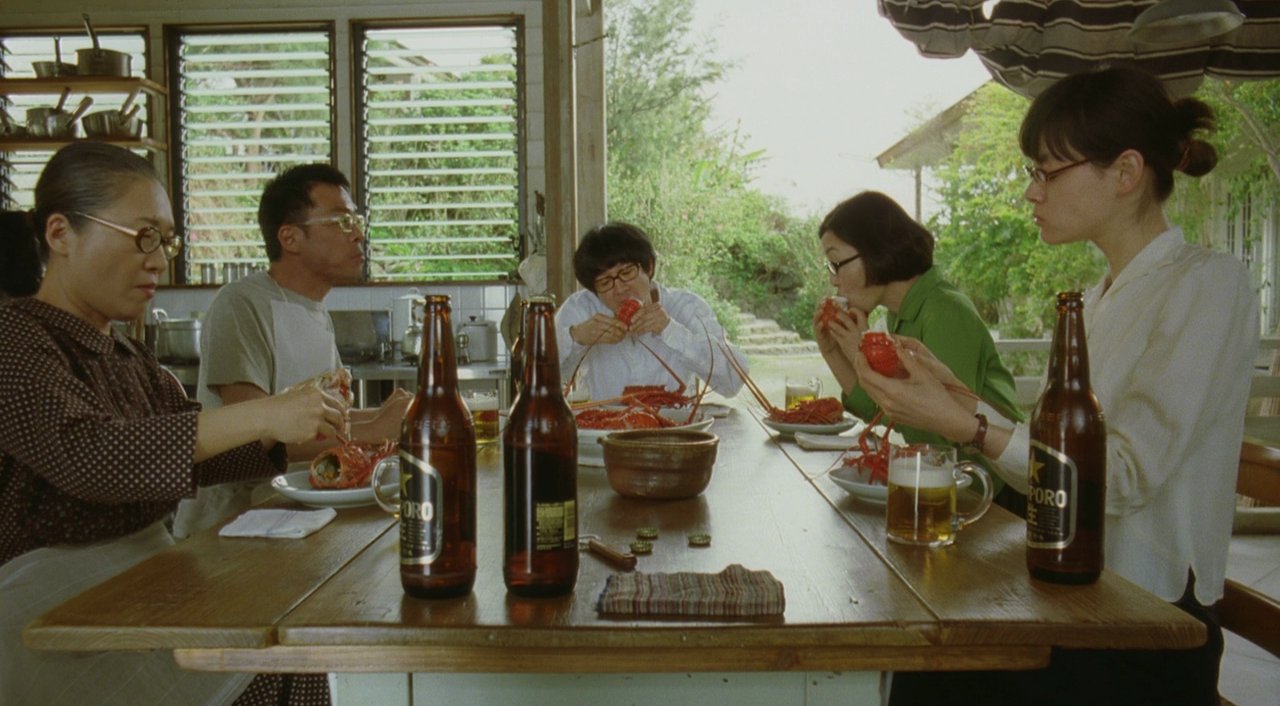 Da qualche parte, forse non lontano, nel cortile deserto di quella che sembra una scuola, una donna dai neri capelli raccolti dondola le gambe, seduta su un tavolo, e beve con la cannuccia quella che forse è una confezione di latte al cioccolato; tutto intorno è immobile e silenzioso: anche lei indossa un paio d’occhiali. Ad un tratto, mentre la telecamera ruota lentamente, smette di bere, si sente un aereo volare in lontananza, lei sembra scuotersi e mormora: – È qui. L’aereo è atterrato, ne scende una signora di mezz’età che indossa un paio d’occhiali, indugia un istante a guardare il cielo e poi con passo sicuro esce dal piccolo aeroporto. I due personaggi di prima, l’uomo sulla spiaggia e la donna dai capelli raccolti, sono ora affacendati ad aprire e preparare un piccolo chiosco di legno sulla spiaggia, quando ecco arrivare la signora sbarcata dall’aereo, cammina lungo la spiaggia. La signora Sakura. In sottofondo ora sentiamo la musica del principale tema musicale del film, un violoncello solista su un dolce tappeto d’archi, un motivo che fa pensare ad una serenità piena e consapevole. Si ferma ad una certa distanza dagli altri due che la stanno aspettando, lentamente si inchina. Per la prima volta vediamo il mare, turchese, che si frange in piccole onde sulla sabbia bianchissima. Un’inquadratura che ha già in sè tutte le tinte dominanti di questo film: tenue azzurro pastello, ocra chiarissimo, turchese.